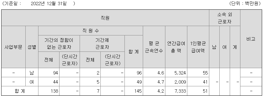 | 사업부문 | 성별 | 직원수 | 평균근속연수 | 평균연봉(백만) |