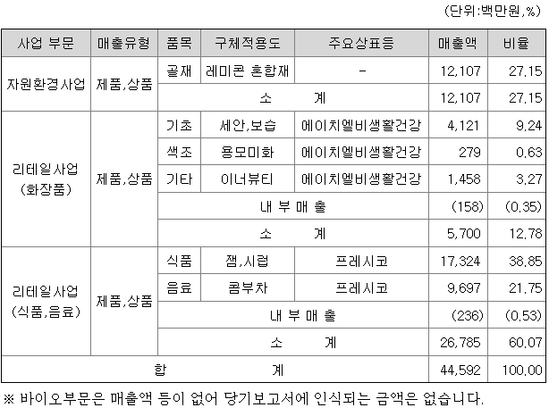 지배기업인 당사 및 연결대상 종속회사가 영위하는 사업은 현재 자원환경, 리테일, 바이오 3개 사업부문으로 구성되어 있으며, 사업부문별 현황은 다음과 같습니다.