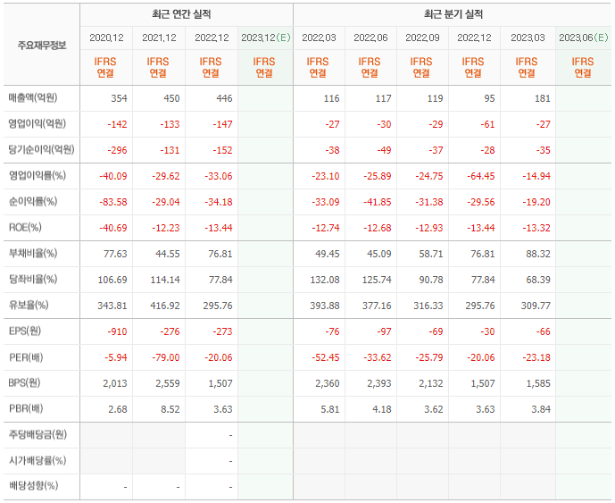 2022년 매출은 446억, 영업이익은 -147억, 당기순이익은 -152억입니다. 그리고 영업이익률은 -33.06%입니다.