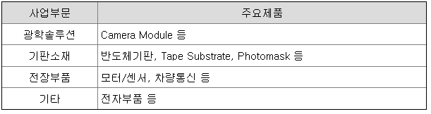 연결실체는 광학솔루션, 기판소재, 전장부품 사업부문의 총 3개 사업부 체제로 운영되고 있습니다. 사업 포트폴리오 관리 강화 목적으로 전자부품 사업을 별도 사업담당체제로 운영하고 있습니다.