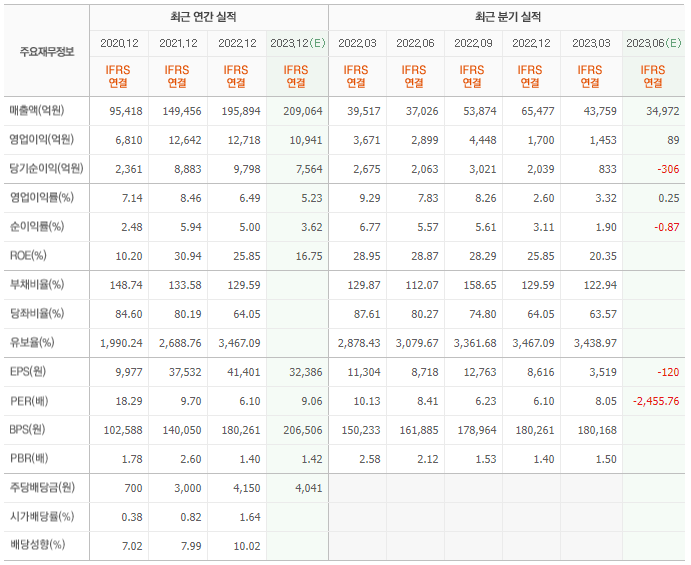 2022년 실적은 19조 5894억, 영업이익은 1조 2718억입니다. 그리고 영업이익률은 6.49%입니다.