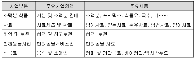 당사가 영위하는 주요 사업으로는 소맥분 제조 및 판매, 사료 제조 및 판매, 하역 및 보관, 반려동물사업, 식음료 판매 등이 있으며 주요 제품으로는 소맥분, 프리믹스, 각종 사료(양돈, 양계, 축우, 양견, 양어), 반려동물 사료, 커피 및 기타음료, 베이커리/멕시칸푸드 등이 있습니다.
