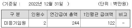 미등기임원의 평균연봉은 1억 2200만원이고 직원수는 2명입니다.