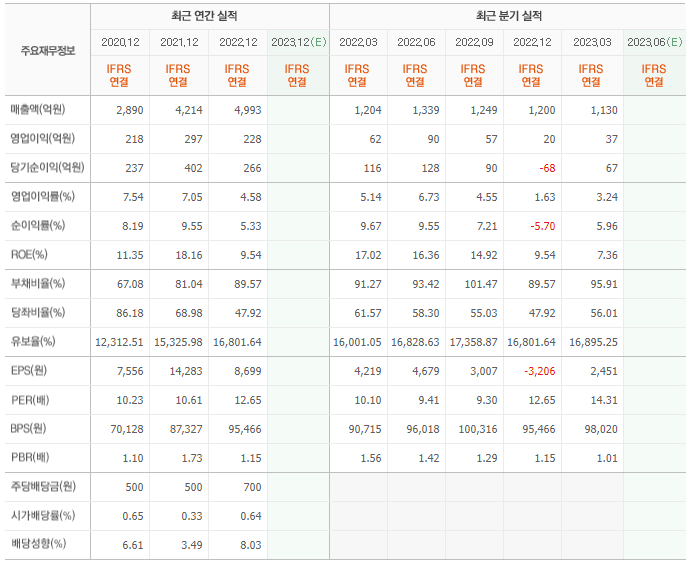 2022년 매출은 4993억, 영업이익은 228억, 당기순이익은 266억입니다. 그리고 영업이익률은 4.58%입니다.