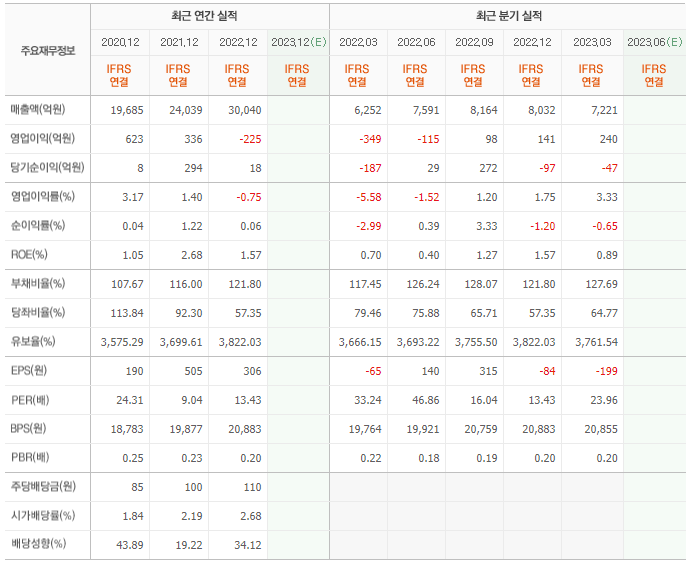 2022년 매출은 3조 40억, 영업이익은 -225억, 당기순이익은 18억입니다. 그리고 영업이익률은 -0.75%입니다.