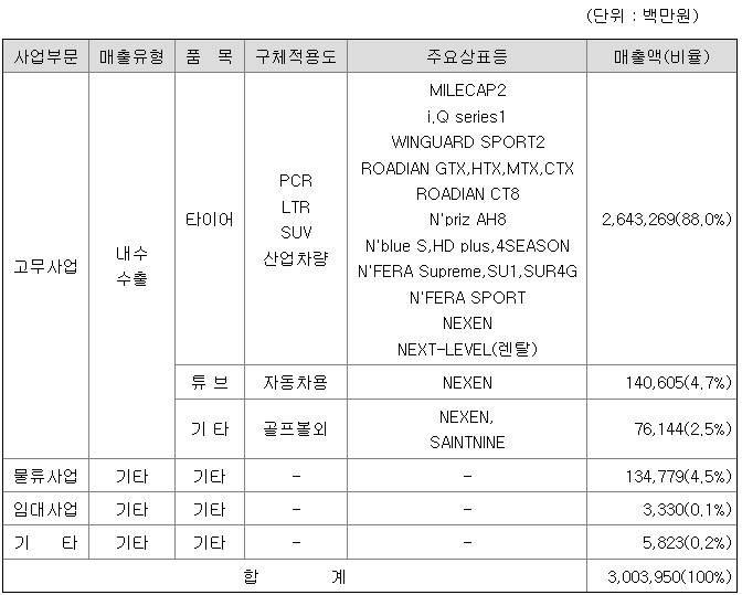 당사는 지주회사이며 고무, 물류, 임대 부문등으로 구분됩니다. 당사의 매출액은 제품, 운송매출 및 관계회사 지분법 수익등으로 구성되어 있으며, 연결조정 후 2022년 12월 31일기준 30,040억원의 매출액을 실현하였습니다.