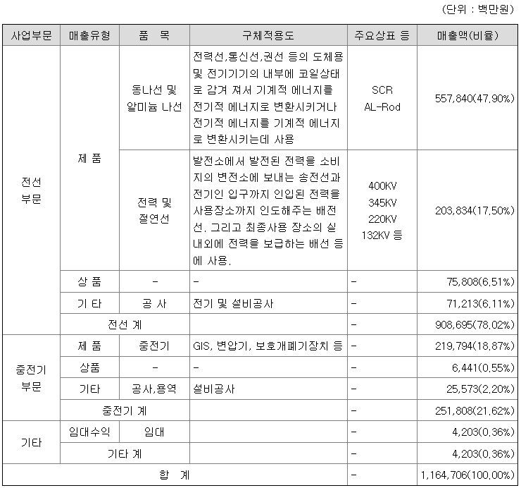 당사의 주요 매출품목 현황은 아래와 같습니다.
