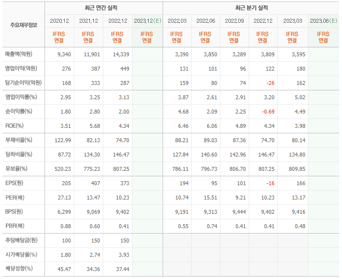 2022년 매출은 1조 4339억, 영업이익은 449억, 당기순이익은 287억입니다. 그리고 영업이익률은 3.13%입니다.