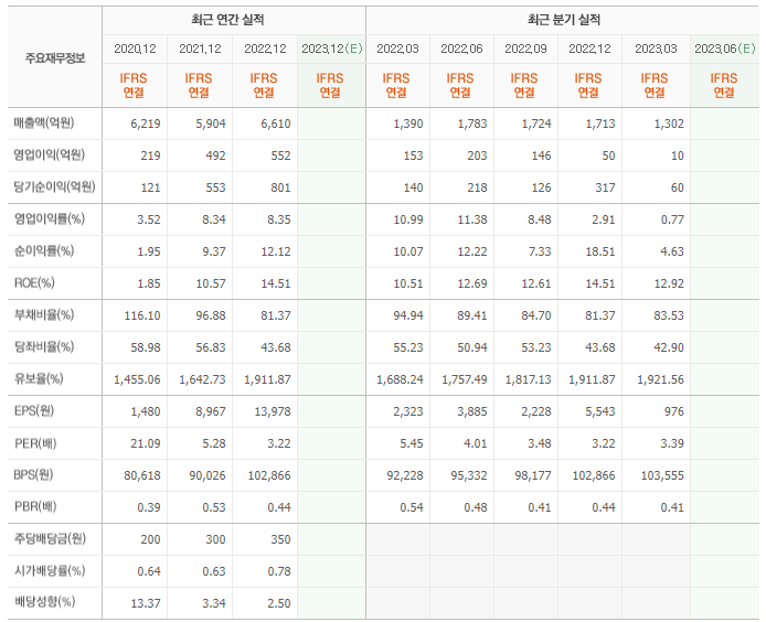 2022년 매출은 6610억, 영업이익은 552억, 당기순이익은 801억입니다. 그리고 영업이익률은 8.35%입니다.