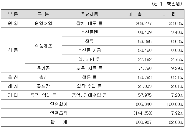 식품사업은 수산물캔 및 수산물 가공, 장류, 김 등의 제품을 생산하고 있습니다. 당사는 지속적인 품질 및 위생관리를 통하여 우수한 제품을 소비자에게 공급하기 위하여 노력하고 있으며, 사조대림과 판매위탁계약을 체결하여 적극적인 마케팅과 영업전략을 통하여 매출규모 및 시장점유율을 꾸준히 확대하고 있습니다.