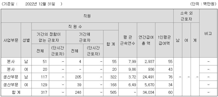 | 사업부문 | 성별 | 직원수 | 평균근속연수 | 평균연봉(백만) |