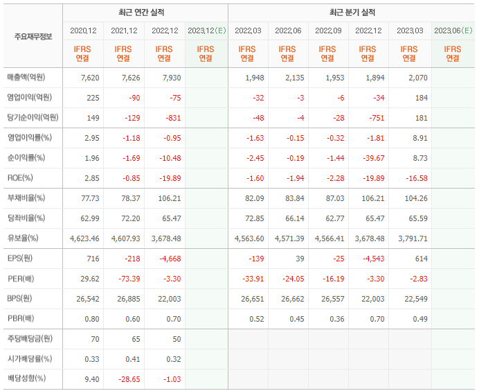 2022년 매출은 7930억, 영업이익은 -75억, 당기순이익은 -831억입니다. 그리고 영업이익률은 -0.95%입니다.