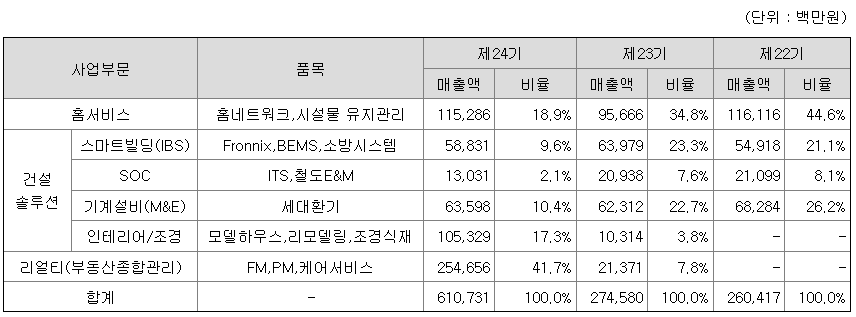 당사는 홈네트워크, 스마트빌딩 및 소방시스템, SOC, 기계설비(M&E), 조경 및 인테리어 등의 건설공사와 부동산종합관리 등 용역서비스를 주요 사업으로 하고 있습니다.