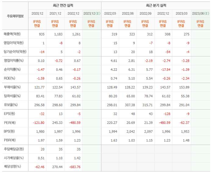 2022년 매출은 1261억, 영업이익은 8억, 당기순이익은 -2억입니다. 그리고 영업이익률은 0.67%입니다.