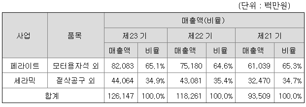 당사 및 종속회사는 모터용 자석, 절삭공구, Magnetron Stem, Faucet Disc, 공구 제품 등을 생산, 판매하고 있습니다.