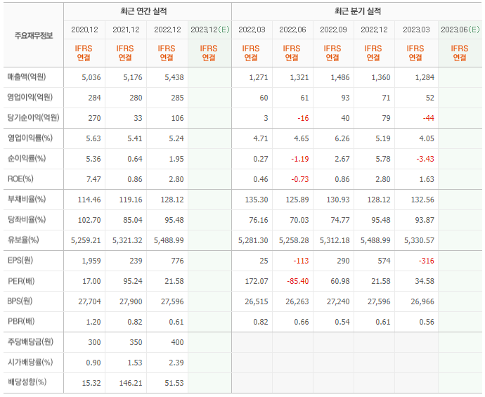2022년 매출은 5438억, 영업이익은 285억, 당기순이익은 106억입니다. 그리고 영업이익률은 5.24%입니다.