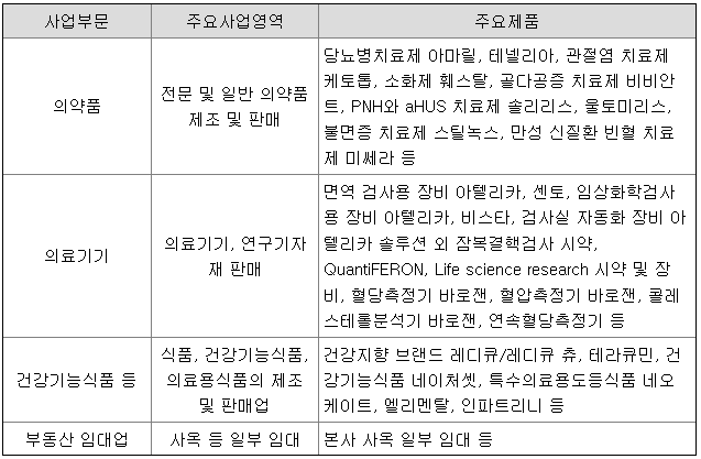 당사가 영위하는 주요 사업으로는 의약품, 의료기기, 건강기능식품, 부동산 임대업 등이 있으며, 주요 제품으로는 아마릴, 테넬리아, 아텔리카, 레디큐 등이 있습니다.