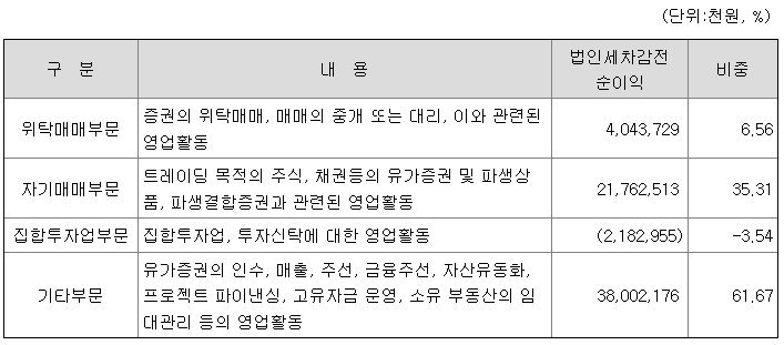 이에 당사는 수익구조의 다변화와 안정적인 균형 달성을 위해 IB, 채권영업 및 운용 부문 등 강점이 있는 부문을 더욱 강화하고 관리부서의 효율성 제고와 저수익 부문의과감한 축소 등 내실을 추구하고자 부단히 노력하고 있습니다.