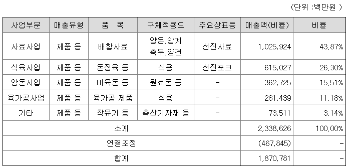 주요 사업부문으로는 배합사료 사업부문, 양돈 사업부문, 식육 사업부문, 육가공 사업부문이 있습니다. 사업부문별 주요 제품으로는 배합사료 사업부문에서는 양돈, 축우, 양계용 배합사료를 생산, 판매하며 양돈사업부분에서는 식용 돼지고기 생산의 원료가 되는 비육돈(원료돈)을 생산하고 식육사업부문에서 원료돈을 가공한 식육제품을 생산, 판매하고 있습니다.