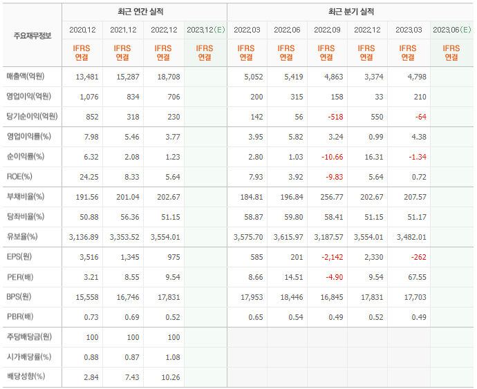 2022년 매출은 1조 8708억, 영업이익은 706억, 당기순이익은 230억입니다. 그리고 영업이익률은 3.77%입니다.