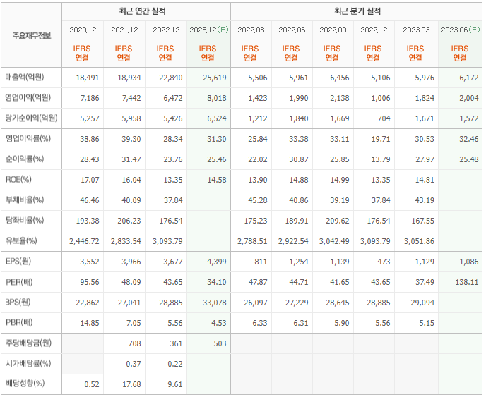 2022년 실적은 2조 2840억, 영업이익은 6472억입니다. 그리고 영업이익률은 28.34%입니다.