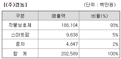 지배회사인 (주)경농은 1957년 설립이래 우수한 작물보호제제품을 생산ㆍ공급함으로써 국가의 식량자급률을 높임과 동시에 농가의 소득증대에 기여해 왔습니다. 주요 생산품인 작물보호제는 제 66기 당기말 별도기준 188,104백만원의 매출(전체 매출액 대비 92.85%)을 기록하였습니다.