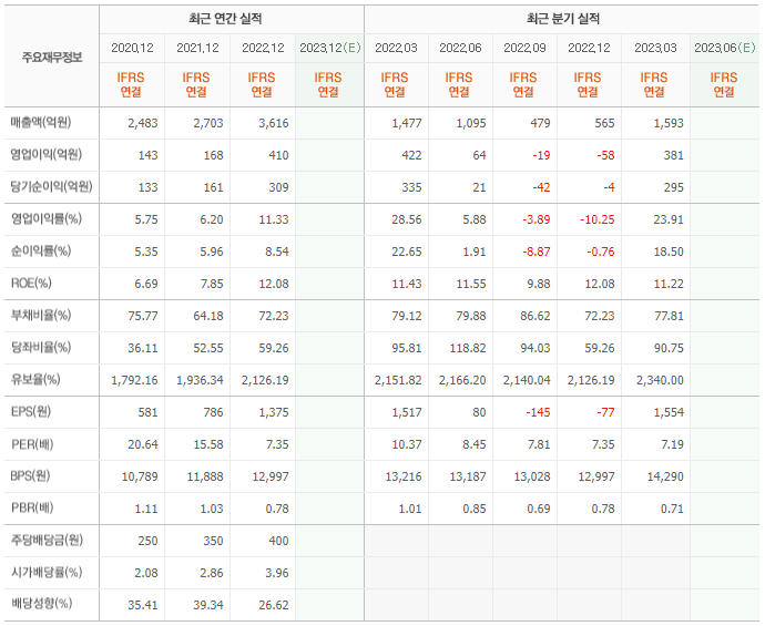 2022년 매출은 3616억, 영업이익은 410억, 당기순이익은 309억입니다. 그리고 영업이익률은 11.33%입니다.