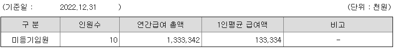 미등기임원의 평균연봉은 1억 3300만원이고 직원수는 10명입니다.