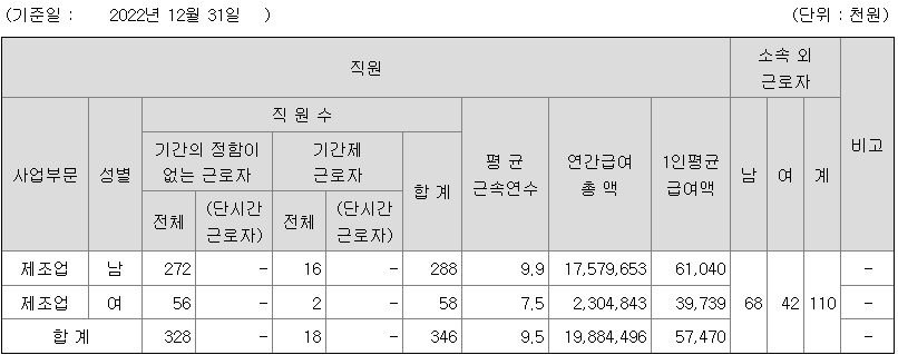 | 사업부문 | 성별 | 직원수 | 평균근속연수 | 평균연봉(백만) |