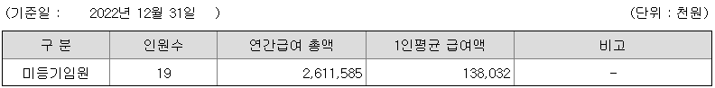 미등기임원의 평균연봉은 1억 3800만원이고 직원수는 19명입니다.