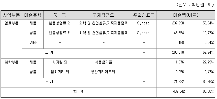 당사 및 종속회사는 염료산업 및 사카린을 비롯한 화학산업을 선도하며, 오늘날까지 성장하였습니다. 또한 고부가가치 산업인 전자재료사업에 진출하는 등 사업의 다각화를 통한 수익성향상을 추진중에 있습니다. 각 사업부문별 주요 제품과 매출비중은 다음과 같습니다.