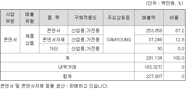사업영역별로 보면 알루미늄 전해콘덴서 및 고체콘덴서를 생산ㆍ판매하는 콘덴서 제품사업과 콘덴서 자재를 생산ㆍ판매하는 콘덴서 자재사업으로 구성되어 있습니다.