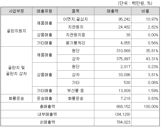 연결회사는 사업의 성격에 따라 3개의 부문(골판지 및 골판지상자 제조, 골판지 원지제조, 화물운송)으로 구분하였습니다.