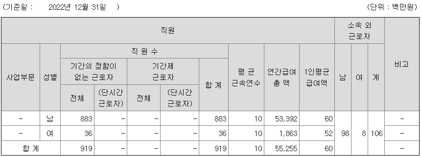 | 사업부문 | 성별 | 직원수 | 평균근속연수 | 평균연봉(백만) |