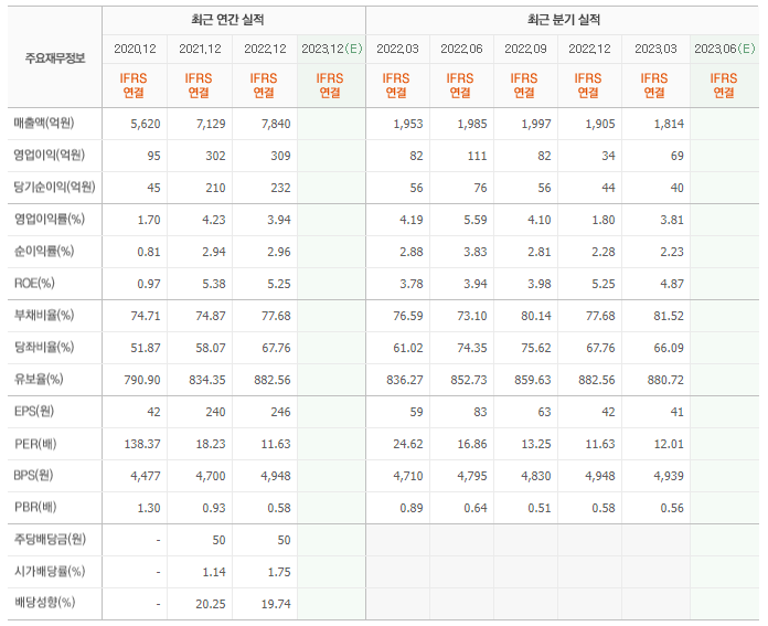 2022년 매출은 7840억, 영업이익은 309억, 당기순이익은 232억입니다. 그리고 영업이익률은 3.94%입니다.