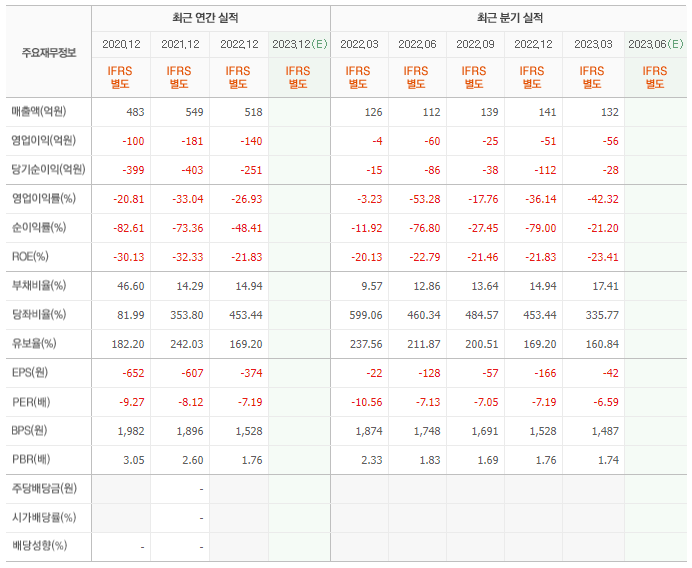 2022년 매출은 518억, 영업이익은 -140억, 당기순이익은 -251억입니다. 그리고 영업이익률은 -26.93%입니다.