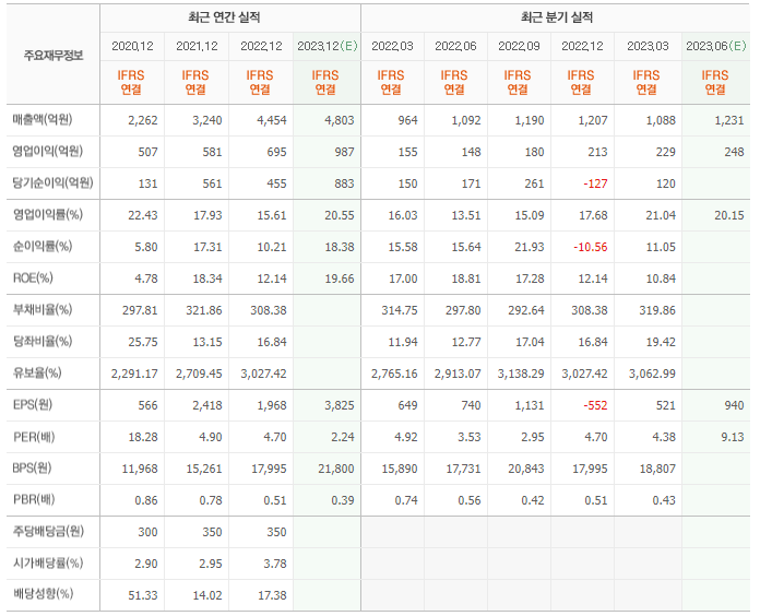 2022년 매출은 4454억, 영업이익은 695억, 당기순이익은 455억입니다. 그리고 영업이익률은 15.61%입니다.