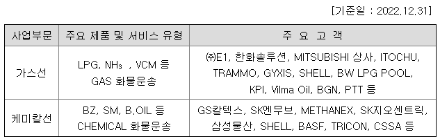 당사는 수익을 창출하는 선박의 종류를 기준으로 사업부문을 가스선과 케미칼선 부문으로 구분하고 있습니다.