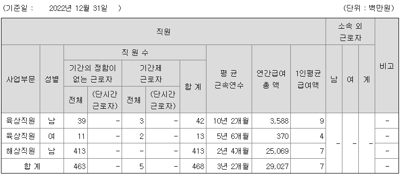 전체 평균연봉은 700만원이고 직원수는 468명입니다.