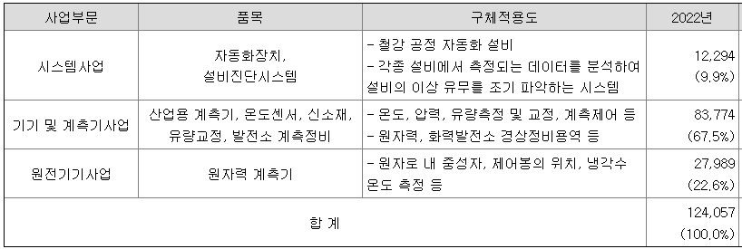 당사는 축적된 계측기 관련 기술력을 응용하여 원자력발전소용 계측기를 핵심사업으로 영위하고 있으며, 이외에 철강산업용 자동화장치, 설비진단시스템, 유량계, 신소재를 주요 사업으로 하고 있습니다.