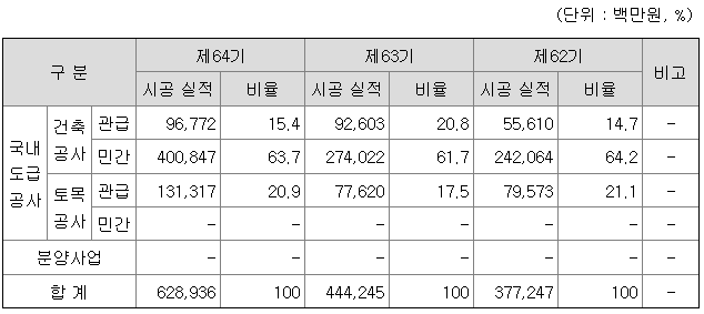당사는 토목 및 건축공사, 주택건설과 판매 등을 주 사업목적으로 1959년 9월 설립되었으며, 종합건설업체로서 크게 토목, 건축/주택, 플랜트의 3개 분야에 진출하고 있으며 발주처에 따라 공공부문과 민간부문의 2개 부문으로 나누어집니다.
