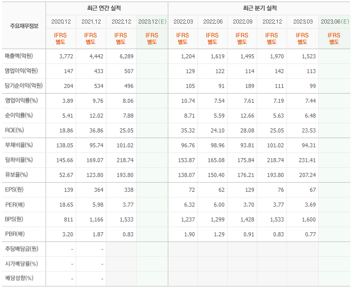2022년 매출은 6289억, 영업이익은 507억, 당기순이익은 496억입니다. 그리고 영업이익률은 8.06%입니다.