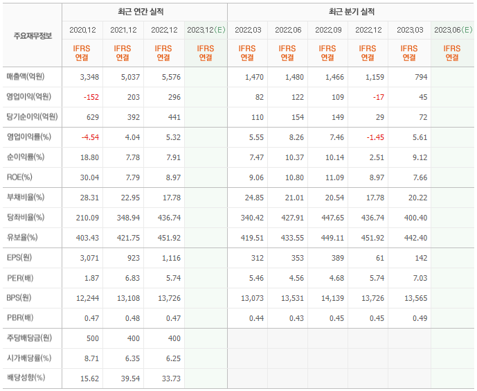 2022년 매출은 5576억, 영업이익은 296억, 당기순이익은 441억입니다. 그리고 영업이익률은 5.32%입니다.