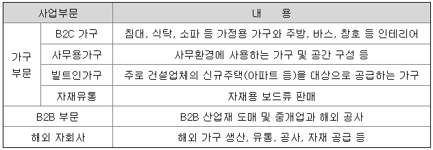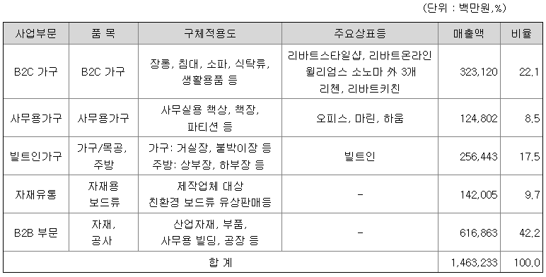 주식회사 현대리바트 및 그 종속회사는 연결기준 가구 부문과 B2B 부문 해외 자회사로 구성되어 있으며, 가구부문은 B2C가구, 사무용가구, 빌트인가구, 자재유통으로 구성되어 있습니다.