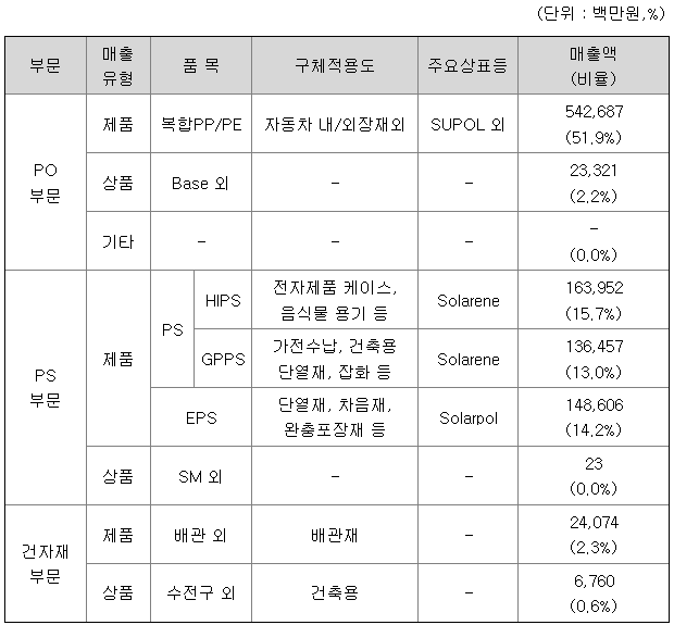 당사는 자동차, 전기전자 산업부품 및 건설자재, 소비재 용도로 사용되는 플라스틱 소재를 공급하는 PO부문과 전기전자 산업, 건자재 용도로 사용되는 PS 및 EPS 소재를 공급하는 PS부문, 그리고 위생배관(급수/급탕 배관, 난방관, 분배기), 소방배관(C-PVC)을 공급하는 건자재부문 등 3개 부문으로 나누어 사업을 영위하고 있습니다.