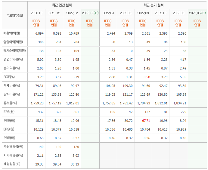 2022년 매출은 1조 459억, 영업이익은 204억, 당기순이익은 104억입니다. 그리고 영업이익률은 1.95%입니다.