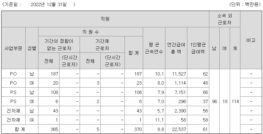 | 사업부문 | 성별 | 직원수 | 평균근속연수 | 평균연봉(백만) |