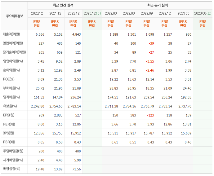 2022년 매출은 4843억, 영업이익은 140억, 당기순이익은 121억입니다. 그리고 영업이익률은 2.89%입니다.