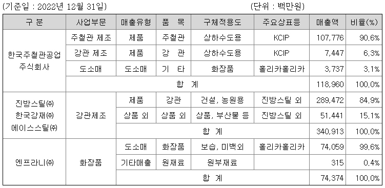 지배회사(한국주철관공업(주))는 선철 및 고철을 원재료로 하여 상하수도관를 생산하는 부산공장과 철코일을 원재료로 하여 상하수도관을 생산하는 포항공장을 영위하고있으나, 모두 상하수도관이 위주이며 포항공장의 생산량이 총매출량에서 차지하는 비율이 매우 낮아 당사는 공시대상 사업부문을 주철관부문으로 단일화하여 표시하고있습니다.