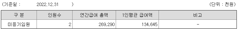 미등기임원의 평균연봉은 1억 3400만원이고 직원수는 2명입니다.